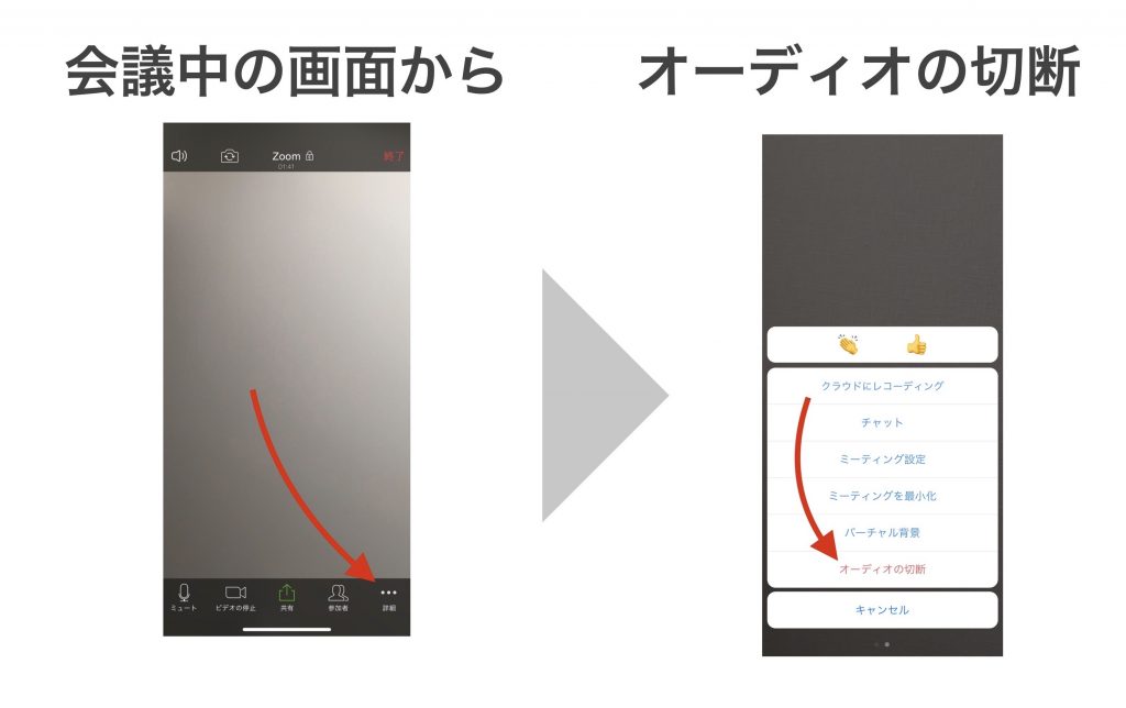 片方の端末で、アプリから「オーディオを切断」することです。 ※Zoomミーティング接続時にオーディオに接続しないを選ぶ方法もあります。