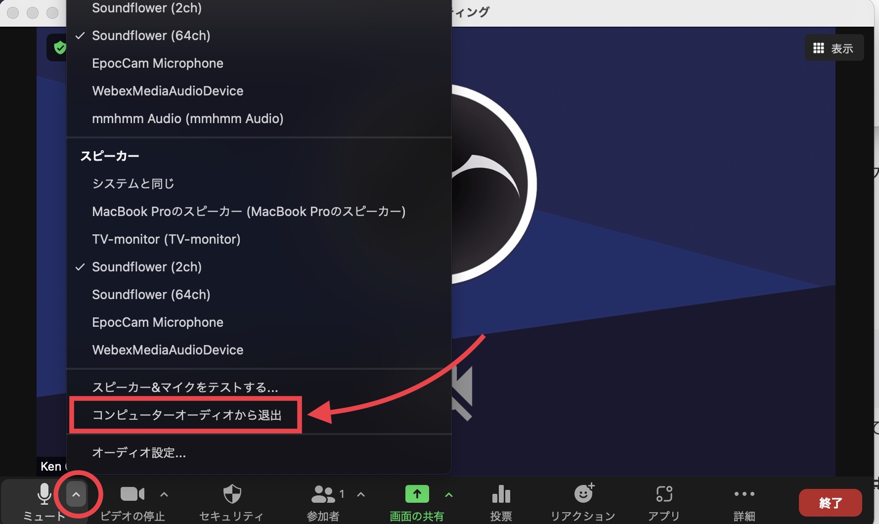 場合は、マイクアイコン横の三角マークから「コンピューターオーディオからの退出 」を選んで下さい。
