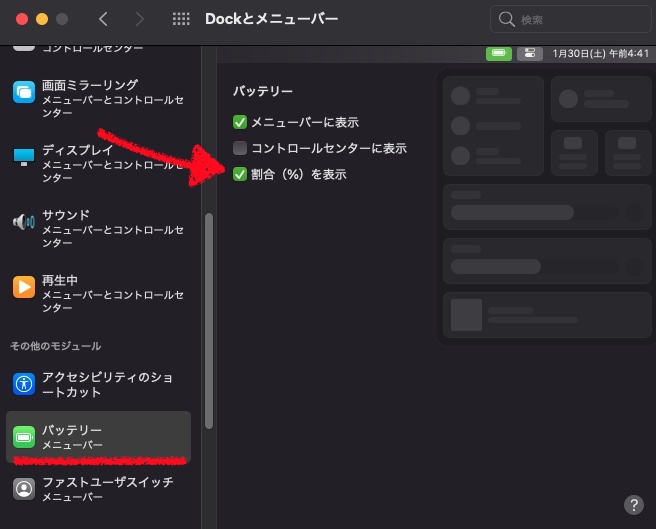 1.システム環境設定> 2.Dockとメニューバー > 3.バッテリー 割合(%)を表示