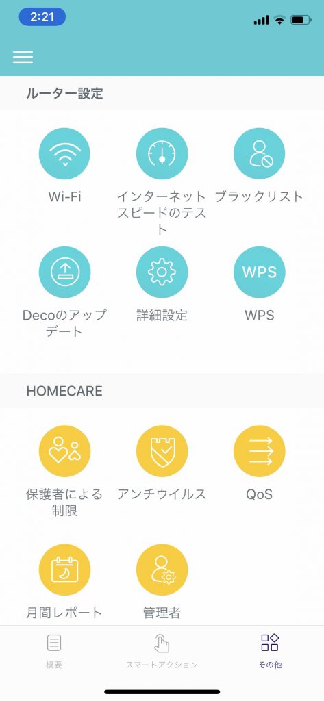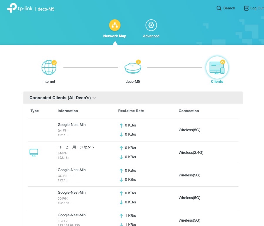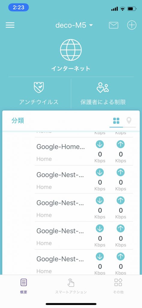 私が愛用しているルーターdeco M5。 老舗ルーターメーカーのTp-Linkが発売しているメッシュ型ルーターです。 興味を持っている人もいると思うので、管理画面をお見せします。 とても使いやすいiOSアプリがあり、全ての接続機器をビジュアルでも見せてくれます。 細かい設定はあまりできませんが、DNSやアドレス予約(機器によって指定のIPアドレスを毎回割り当てる機能)、ポート転送、ペアレンタルコントロールなどの設定もできます。