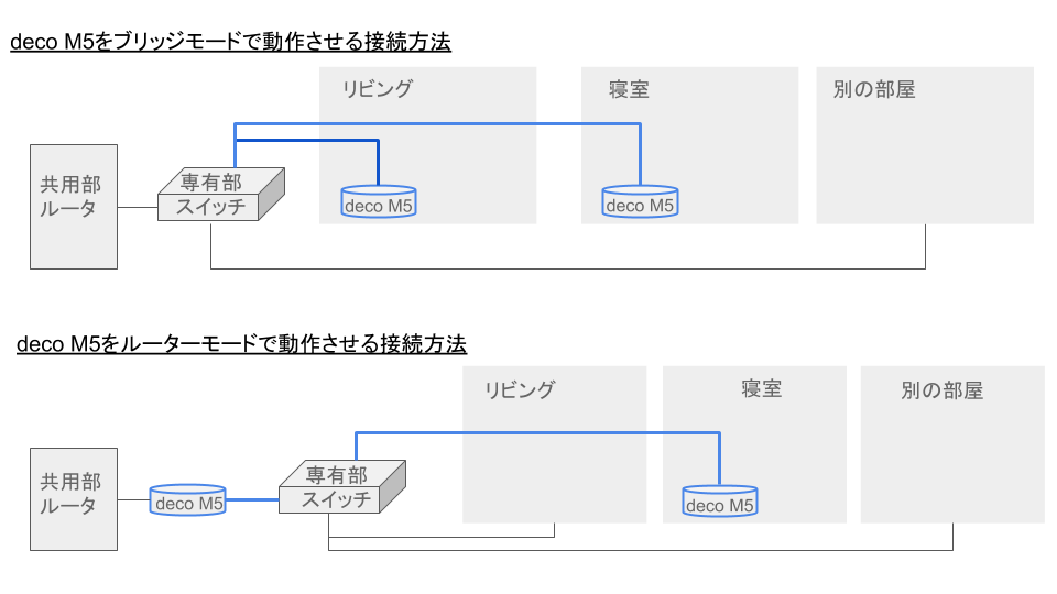 我が家(マンション)には各部屋にマルチメディアコンセントという有線LANの接続口があります。 当然これを使えば、イーサネットバックホール機能を使うことが出来ます。 しかし設置場所によって、メッシュルータが、ブリッジモード(ルータ機能オフ)となるか、ルータモードになるかの違いが出てきます。 図を見て頂くと一目瞭然かと思いますが、 我が家はマンションなので、ルータが共有部にあり、専有部である宅内には、スイッチが置かれていました。
