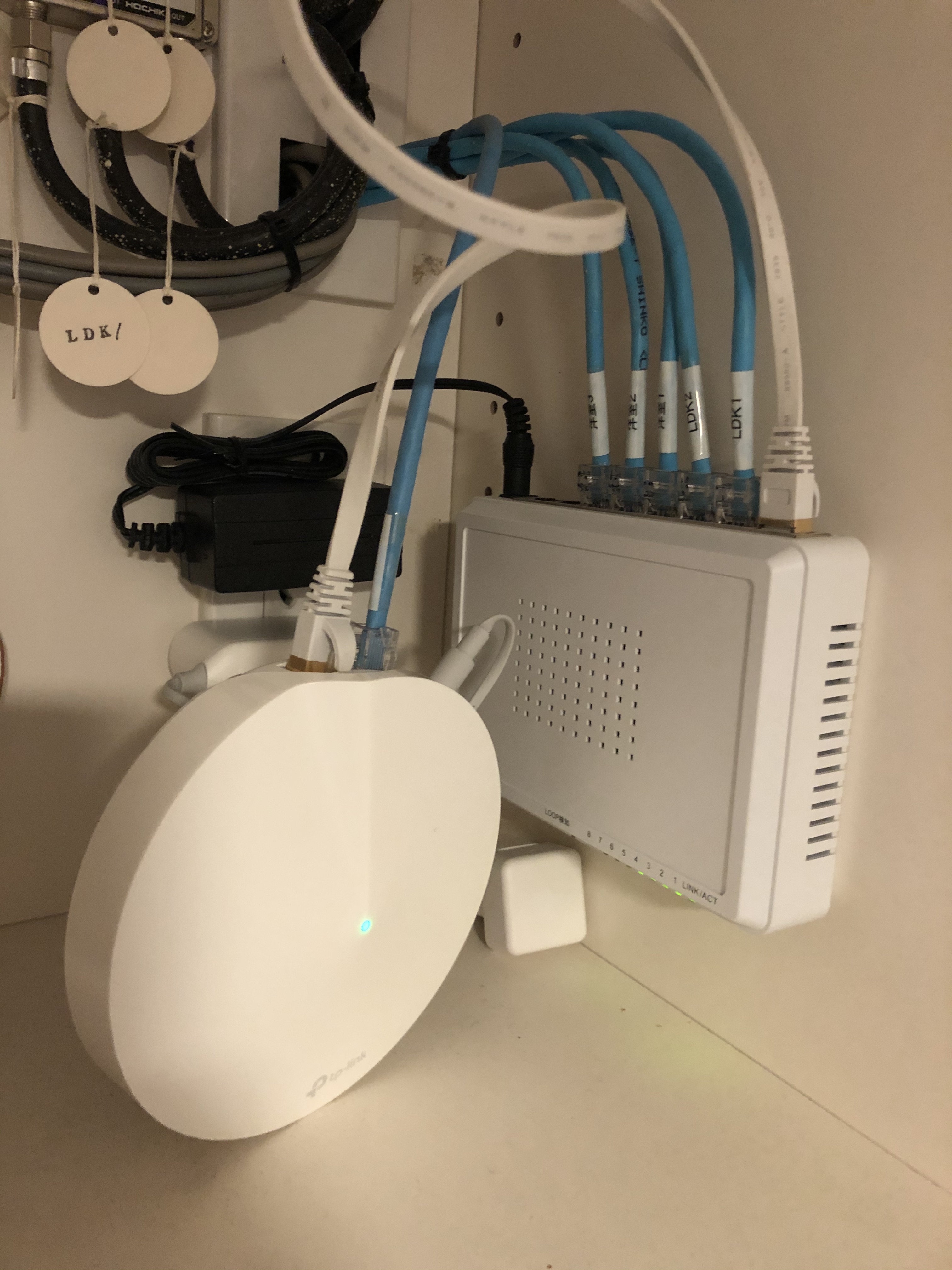 画像の左に見えるのがtp-link Deco M5 右側の四角いのがスイッチ(ハブ)です。 元々は青いLANケーブルが右のスイッチに繋がっていました。 今回は、この内の共用部から繋がっているLANケーブルをdeco-m5に差し替えて、別のLANケーブルで、Deco M5からスイッチングハブへ指し直しました。