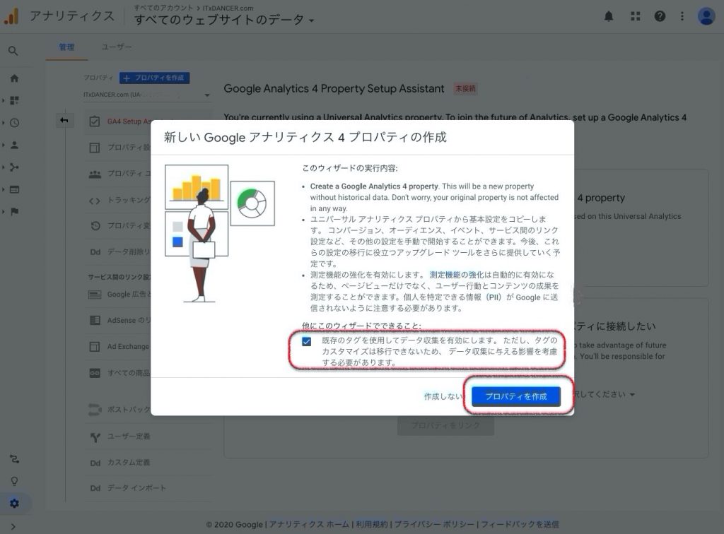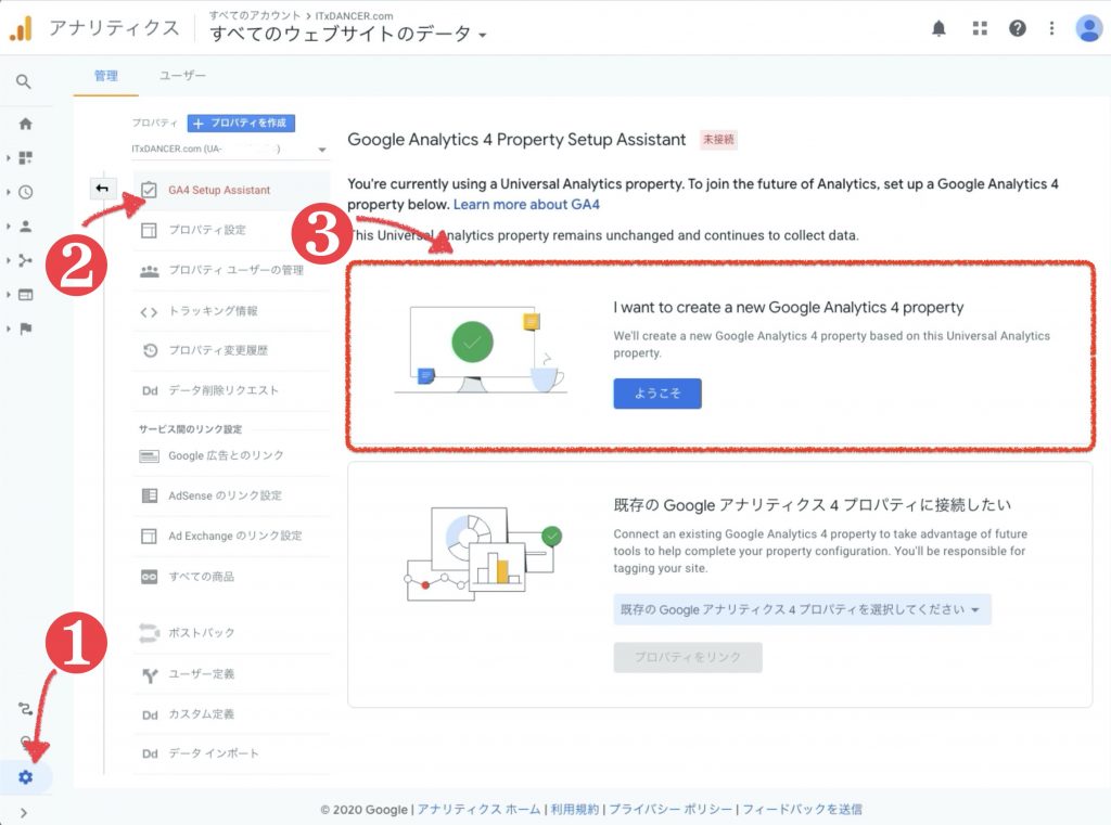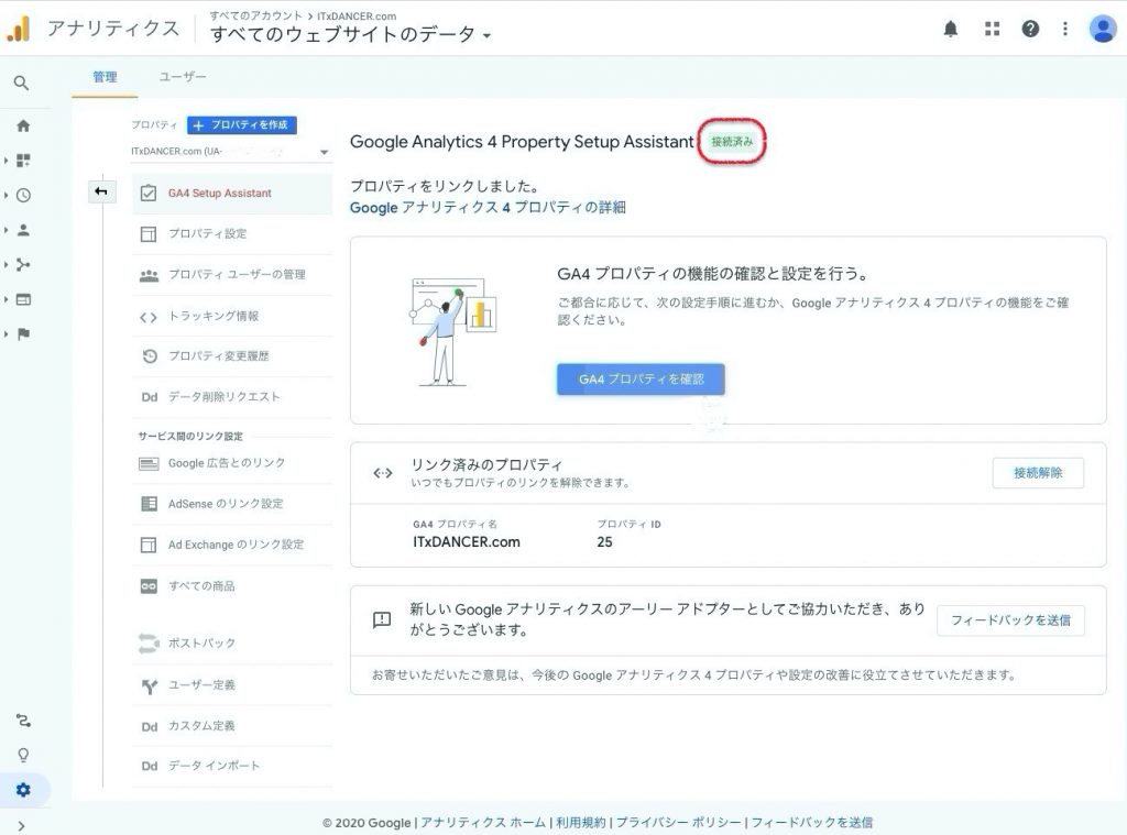 1.プロパティーの中からGA4 setup Asistant(GA4へのアップグレード)をクリック この画面上では英語表記になっていますが、日本語で表示される場合はこのように表示されます。 2.新しいGoogleアナリティクスプロパティの作成 チェックを入れて、プロパティを作成 ※サイトで gtag.js タグを使用している場合は、チェックボックスが有効化されます。(詳細はこちら 3.Finish! 接続済みと表示されていますか?