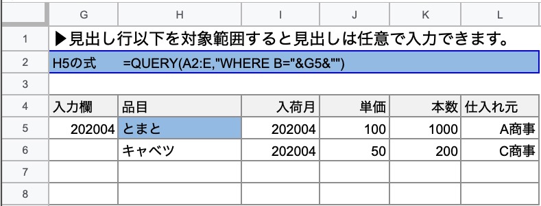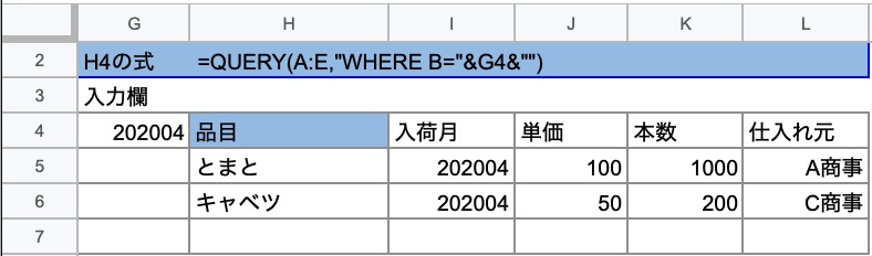 =Query(A:E,“WHERE B=“&H4&"") A:EにあるデータのB列がH4と一致するものを表示させる。