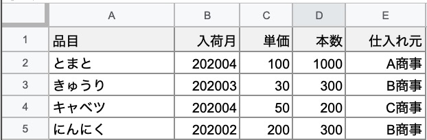 先のA:Eの表から、以下のG4に入力された202004というデータに一致するものを表示させています。 なお関数はH4入力しています。 ※元になる表の全体(A〜E列)を選択しているので、見出しも表示されています。