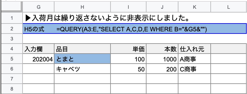 =Query(A:E,“WHERE B=“&H4&"") A:EにあるデータのB列がH4と一致するものを表示させる。