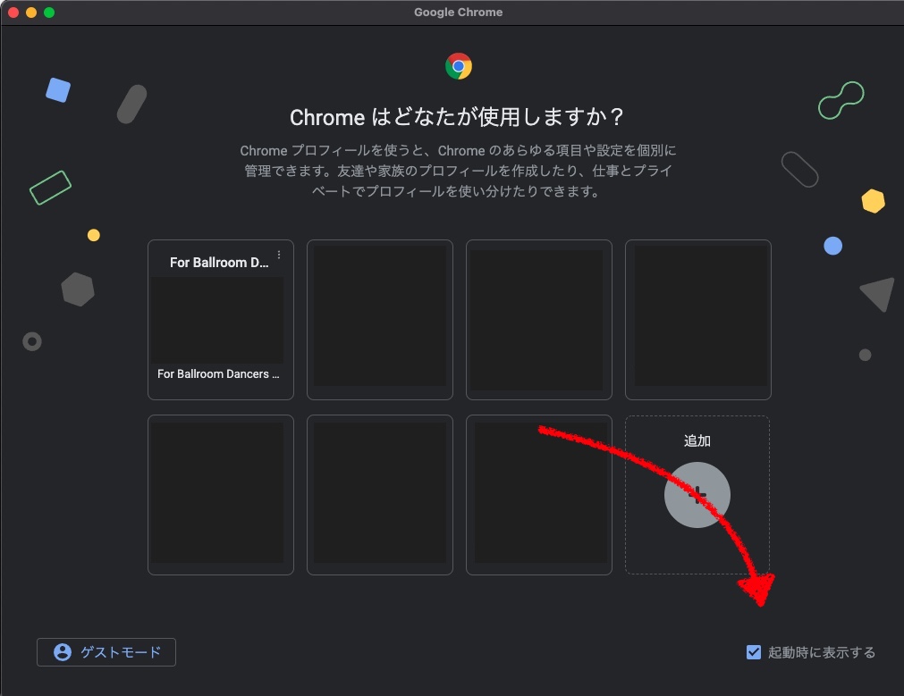 ブラウザ右上のアカウントのアイコンをクリックし、他のプロフィールの横にある設定マークをクリックします。 続いて表示されるアカウント一覧画面(Chromeはどなたがしようしいますか?)の右下で、「起動時に表示する」ボタンにチェックをつけます。