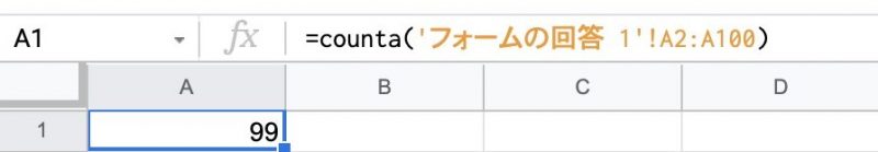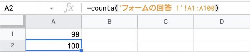正しい関数の設定は以下のように1行目を範囲に含むように設定します。 ※もし見出しの分を差し引きたければ、=counta(‘フォームの回答 1’!a1:A100)-1という関数にすればよいでしょう。