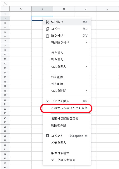 共有リンクを取得したいシート上の特定のシート上で右クリック このセルへのリンクを取得
