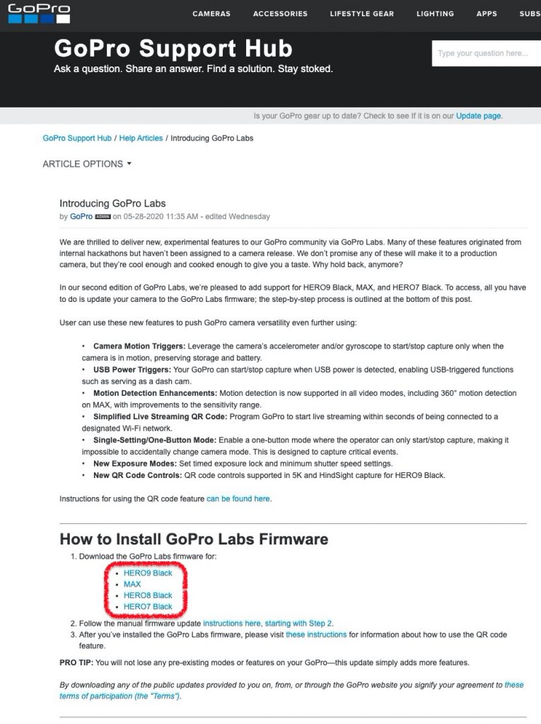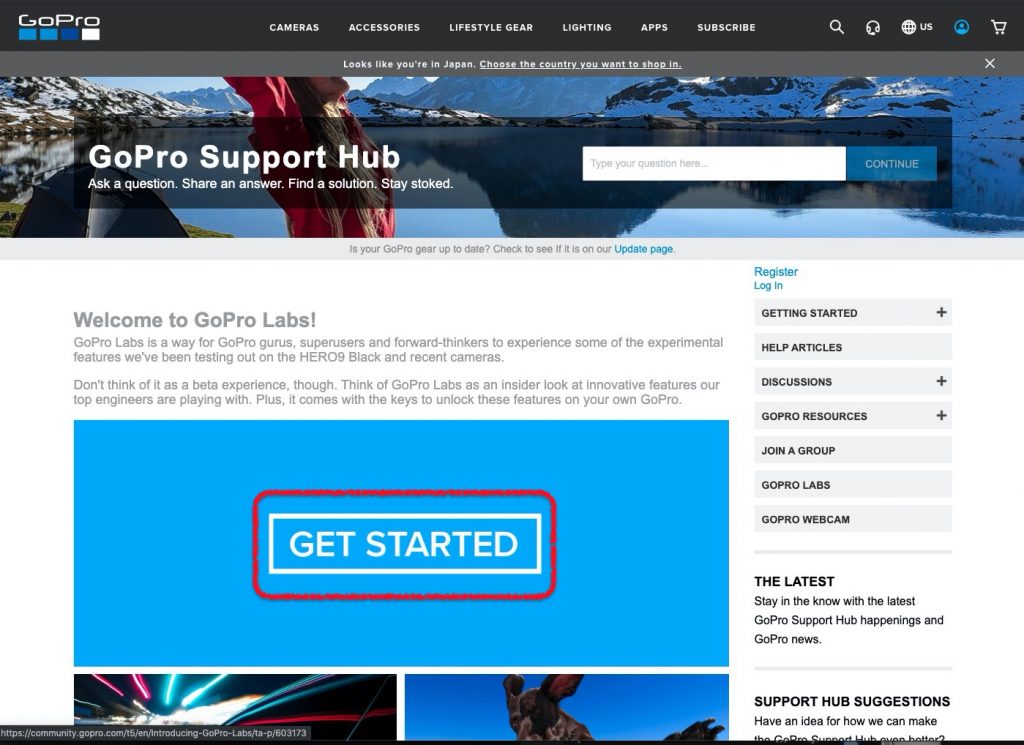 GoPro Labにアクセス https://community.gopro.com/t5/GoPro-Labs/ct-p/GoProLabs 日本語サイトだとなぜかGoPro Hero8だけしかアップデートできないので、英語サイトの状態で”GET STARTED”をクリック。 ※言語の変更が必要になった場合はフッター右下にある言語設定からUS/ENを選んで下さい。