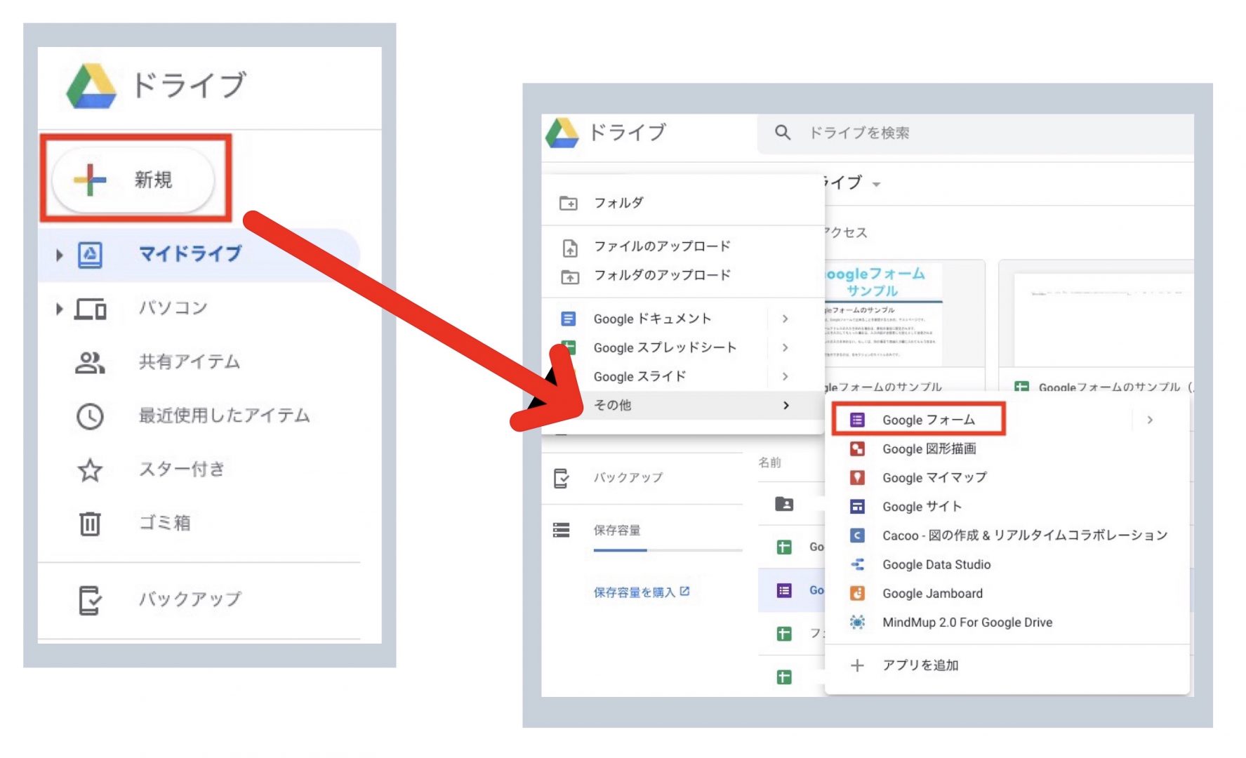 Googleドライブにログイン 「左上の作成ボタン」から、「その他」> 「Google フォーム」 こんなところに隠れています。 もちろんGoogle フォームページからも作成できます。