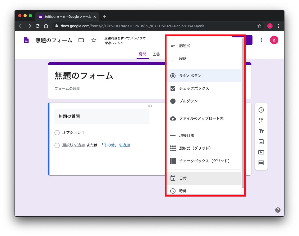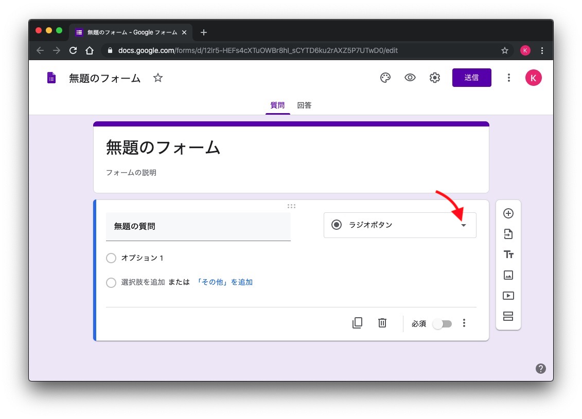 ラジオボタンと書かれたところの下向き矢印から選択すると、質問の形式を選ぶことが出来ます。