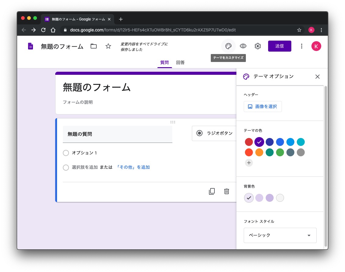 右上のパレットのアイコンをクリックすることで、フォーム全体の色味、フォント、ヘッダー画像を設定することが出来ます。