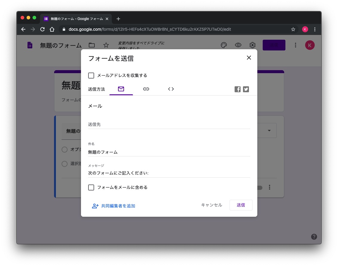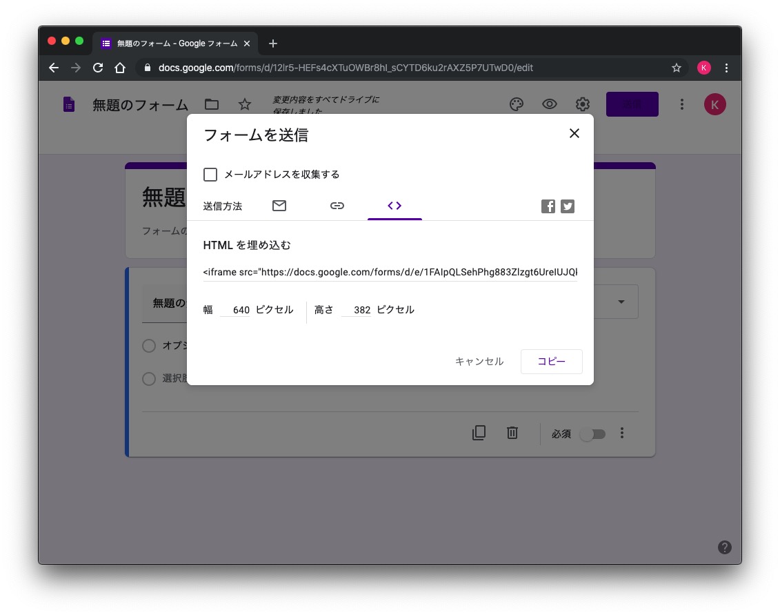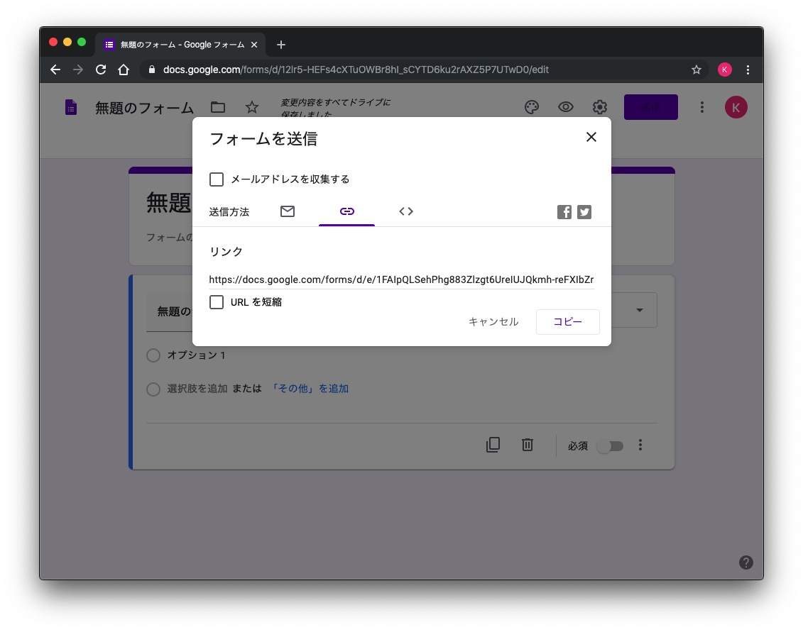 作成したフォームへリンクするためのURLを取得できます。 標準ではかなり長いURLですが、URL短縮の機能もあります。