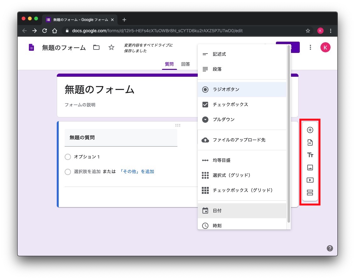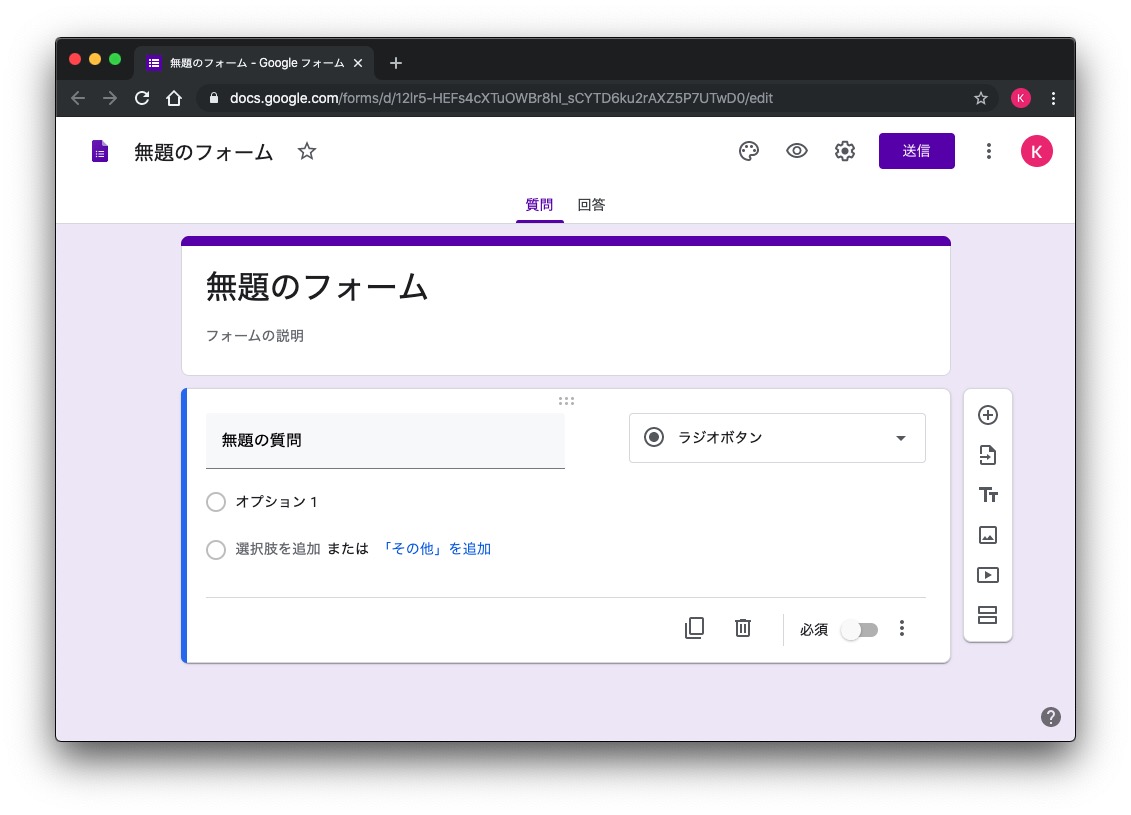 「フォームのタイトル」と、「フォームの説明」の入力欄と、サンプルとして一つだけ質問項目が設置さています。 初期設定の質問項目は、ラジオボタンになっています。