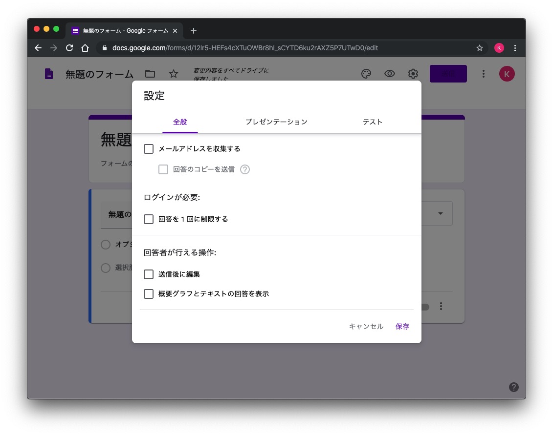 「メールアドレスを収集する」にチェックを入れると、フォーム利用時にreCHAPCHAが表示されやすくなります。 送信者のフォーム入力内容のコピーが、送信者のメールにも送られるようにするには、「メールアドレスを収集する」をチェックした上で、「回答のコピーを送信」のチェックを入れます。