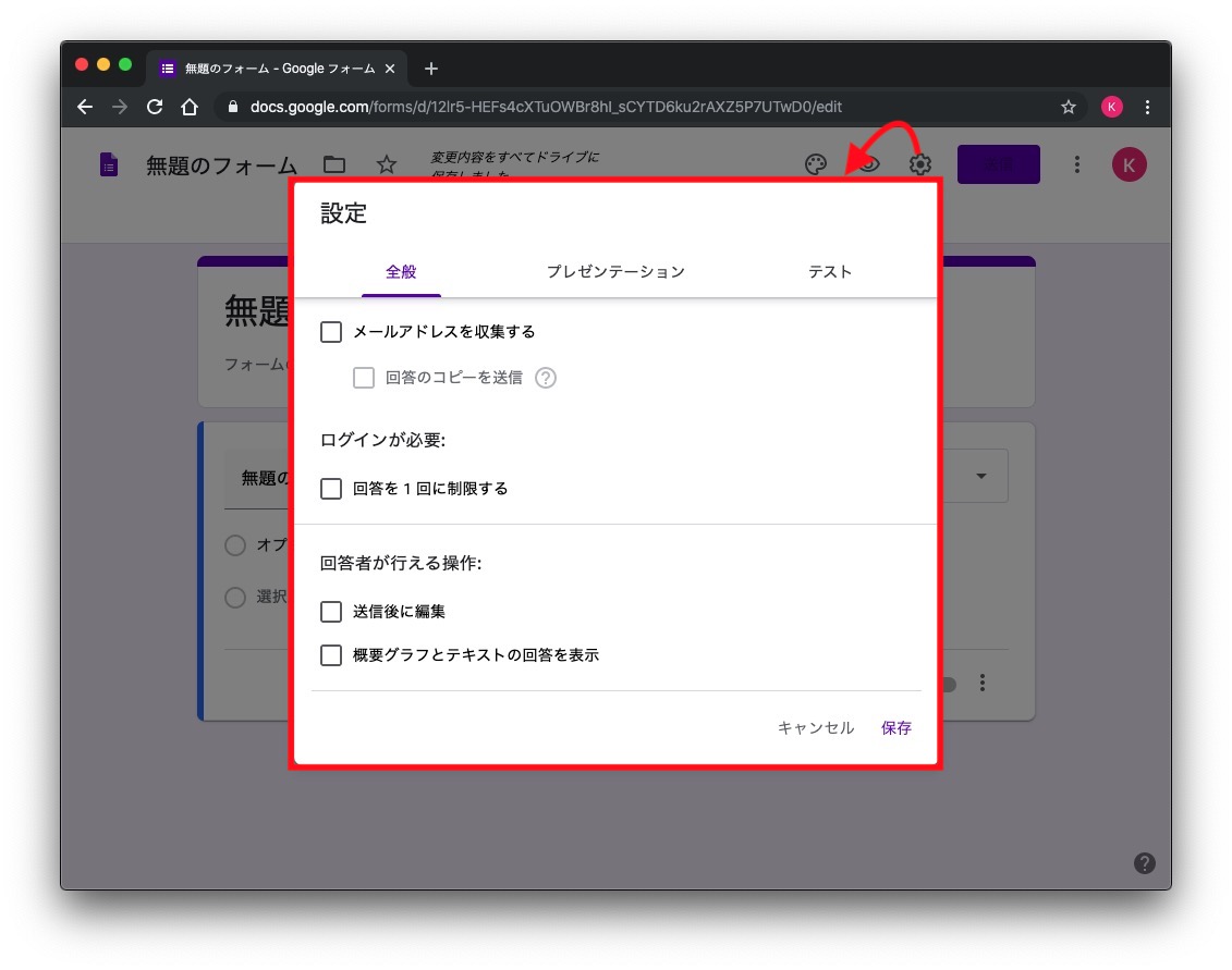右上のパレットのアイコンをクリックすることで、フォーム全体の色味、フォント、ヘッダー画像を設定することが出来ます。
