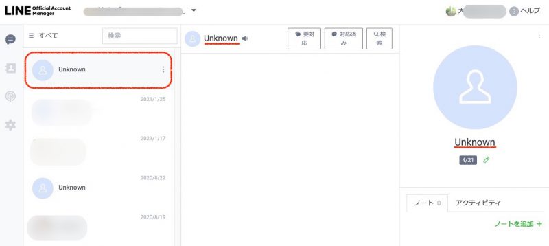公式LINEアカウントは、運営側から直接メッセージを送ることができないが、応答設定がの応答モードをチャットにしておけば、登録者から個別メッセージを受け取ることができ、そこでは一対一のやり取りが可能になる。 しかし一定期間が経過すると、チャットルームの名前表示がUnknownとなってしまいます。なお、誰だかわからなくなったチャットですが、その履歴は1年前まで表示されています。