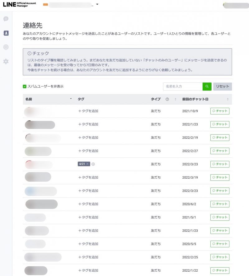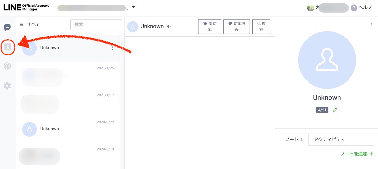 公式LINEアカウントでは、メッセージが送ってきた登録者は連絡先に登録され、一定の期間が経ちチャットでUnknownとなっても連絡先からチャットを送ることができます。 ※チャットのやり取りがない登録者は連絡先には登録されません。