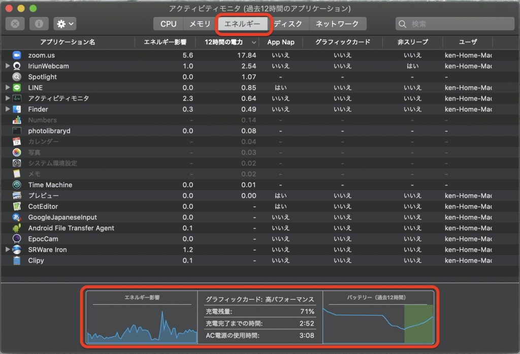 時系列でバッテリーの使用時間と、充電時間 その間のバッテリー残量変化 この時間に急にバッテリーが減ってるな。とか、 充電してたけど、100%まで充電できてなかったんだとか。 もっと詳しく見ると、 過去12時間で、どのアプリケーションがたくさんの電力を消費したか? 今どのアプリケーションが電力を大量に使っているか? さらにMacBook Pro 16インチのように外部GPUを搭載している場合、外部GPUを使っているのはチップセット内蔵GPUを使っているのかも分かります。 ※外部GPUは多量の電力を消費します。