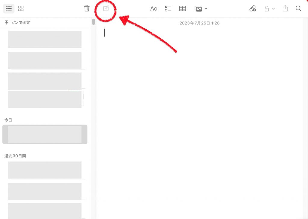 Macのメモアプリ、編集はできるんだけど、新規メモが作れなくなってしまった。