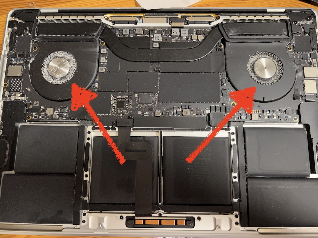両サイドから2つのファンで吸気して、画像上部方向に排気します。 MacBookの裏側の画像です。