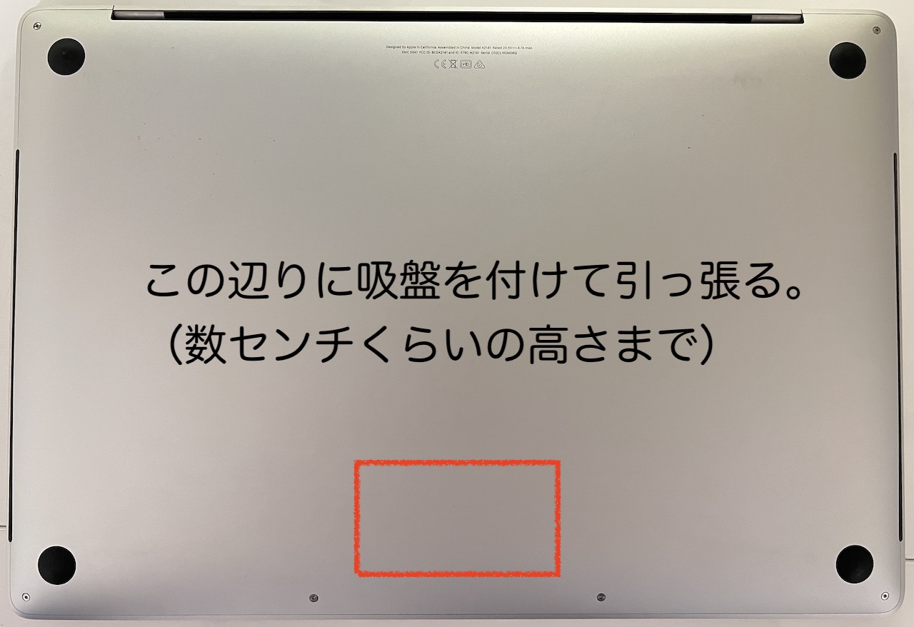 本体のヒンジ側と、中央部分に引っ掛けるパーツが付いているので、ネジを外しただけでは、裏蓋はすんなりとは開きません。 吸盤とスクレイパーを使って引っ張り上げます。 吸盤を付ける場所はヒンジ側ではなく、手前側(画像赤枠のトラックパッド裏位)が良さそうです。 うまく引っ張りながらスクレイパーや指を差し込んでいくと、パンと音がして中央部分に横方向に並んだ引掛けパーツが外れます。 なお、この時点では、完全に裏蓋は大きく開かないので、開きすぎてバックパネルを曲げないように注意しましょう。 先に紹介したドライバーセットにスクレイパーも引っ張る用のリング付き吸盤も付いています。 手こずったのはこの次。。