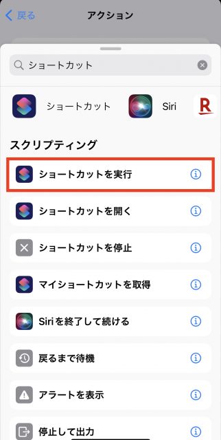 アクションの画面の一番下「Appおよびアクションを検索 」のところで「ショートカットアプリ 」と入力 ↓ スクリプティングから、「ショートカットを実行 」 ↓ アクション画面に追加されたアクションの薄文字にになっているショートカット の部分をクリック。 するとマイショートカットの一覧が出てきます。