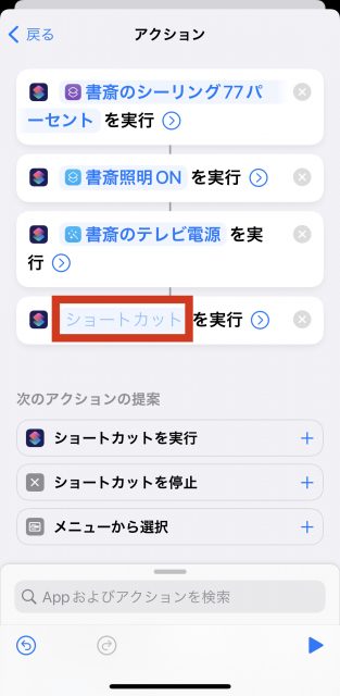 アクションの画面の一番下「Appおよびアクションを検索 」のところで「ショートカットアプリ 」と入力 ↓ スクリプティングから、「ショートカットを実行 」 ↓ アクション画面に追加されたアクションの薄文字にになっているショートカット の部分をクリック。 するとマイショートカットの一覧が出てきます。