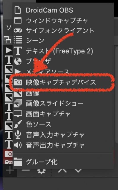 ソースエリアの左下にあるプラスボタンから、映像キャプチャデバイス をクリック