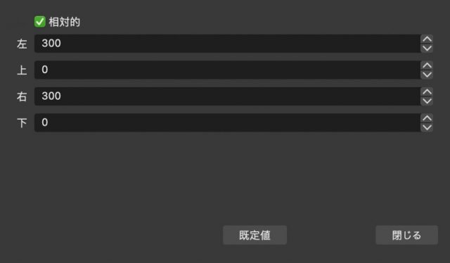 1で設定したWebカメラ(ソースに設定した映像キャプチャデバイス)を右クリックして、フィルタ を選びます。 OBS Studioでフィルタを設定する フィルタ画面左下のエフェクトフィルタボックスから、左下の+ボタンから、クロップ/パッド を選択します。 クロップ/パッド の設定画面。 上下左右それぞれ別々の値を設定することが出来るので、固定されたWebカメラであっても、右だけだったり、上だけだったり設定を変えることができます。