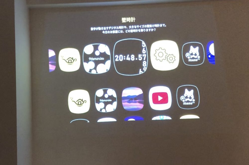 我が家は小さい6畳のお部屋だったので1.8m、約60インチのスクリーンになりました。popIn Aladdinの持つ最大サイズが120インチなので、勿体無い気もしましたが、元々置いていた43インチの4Kテレビと比べてもかなり大きく感じました。 高さを選べるので、少し高めの位置に投影することで、ベットからも見やすいという印象もありました。 ちなみに、投影されるサイズは、設定画面から小さくすることも可能です。