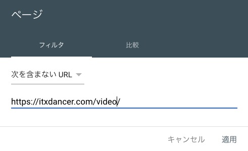 - プルダウンメニューから”次を含まないURL”を選択し、除外したいURLを入力。