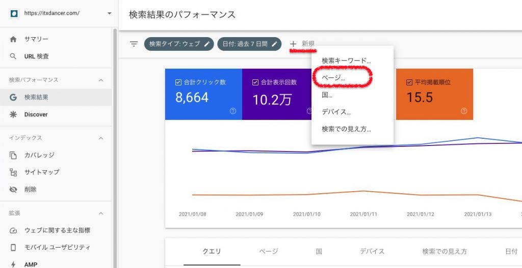 - ”Seach Console”の”検索パフォーマンス”の”検索結果”をクリック
