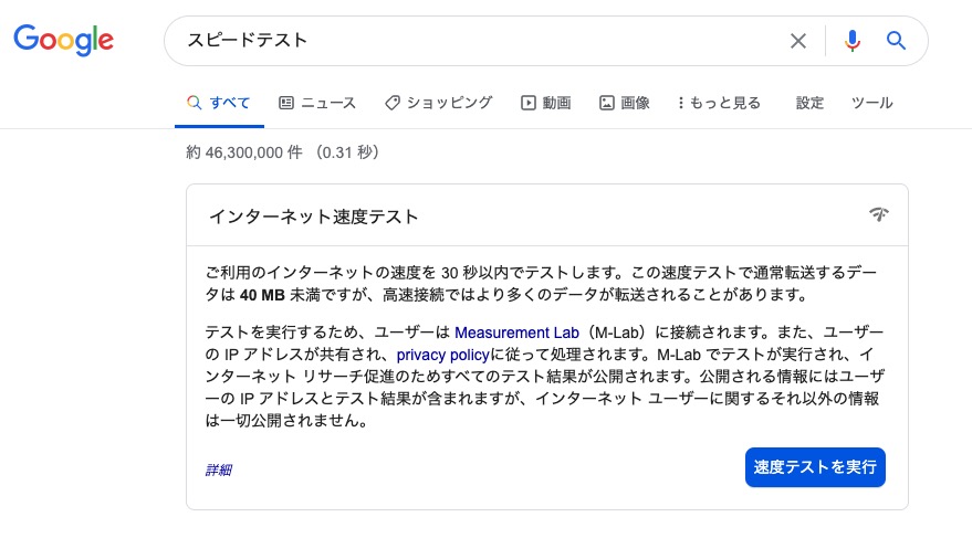 Googleで「スピードテスト」と検索、1番目に表示される「インターネット速度テスト」から、青のボタン【速度テストを実行】をクリックするだけです。 Google公式のサービスです。M-Labというとっころと共同で行っているサービス。 使用するデータ量は、4.4MBなので、音楽を1,2曲分ストリーミングする程度。外出中にスマホでテストしても、さほど気にならない量です。