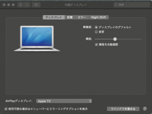 サブディスプレイを、パソコンのメイン画面に対して、どこに配置するかを指定する画面です。 実際にテレビをどこに置いてあるのかで決めると良いでしょう。 例えば、パソコンに対してテレビが右側にあれば、右に配置する形です。 するとパソコン上でマウスを右に動かして、パソコンの画面の端に来てそのまま動かすとテレビにマウスが移る感じになります。 サブディスプレイの配置画面の出し方は、上記の方法でAirplayを接続した状態で、Macの”システム環境設定”から”ディスプレイ”を選び、以下の画面の、配置を選びます。