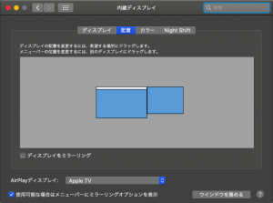 サブディスプレイを、パソコンのメイン画面に対して、どこに配置するかを指定する画面です。 実際にテレビをどこに置いてあるのかで決めると良いでしょう。 例えば、パソコンに対してテレビが右側にあれば、右に配置する形です。 するとパソコン上でマウスを右に動かして、パソコンの画面の端に来てそのまま動かすとテレビにマウスが移る感じになります。 サブディスプレイの配置画面の出し方は、上記の方法でAirplayを接続した状態で、Macの”システム環境設定”から”ディスプレイ”を選び、以下の画面の、配置を選びます。