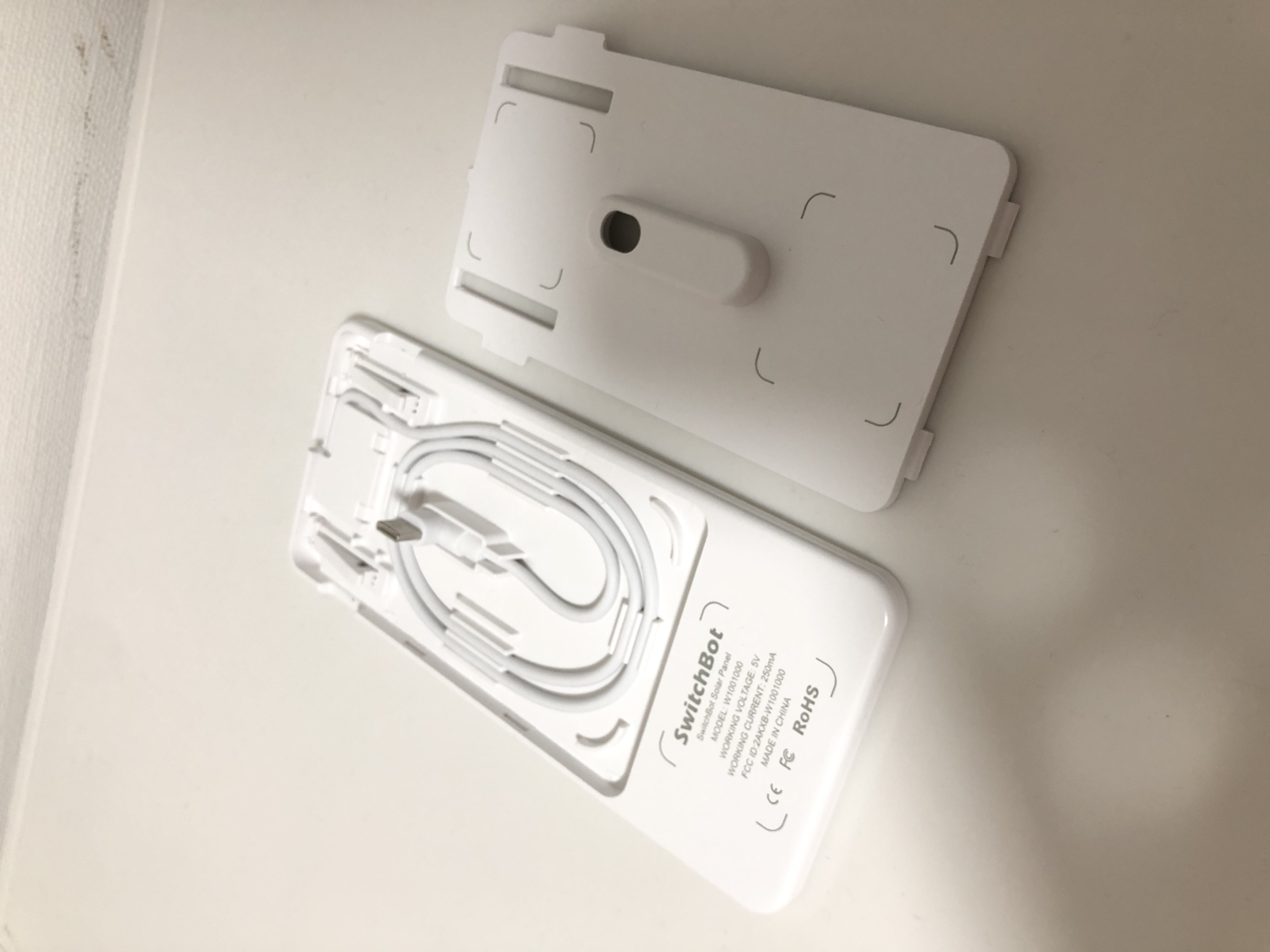 別売りのソーラーパネルもSwitchBot本体に簡単に装着できました。 がカーテンレールは天井近くにあるため太陽が当たりにくいこともあります。 そのために、このソーラーパネルだけ、カーテンの下の方(太陽があたるところ)にずらして設置することができます。