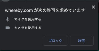 - 参加者は、そのURLにアクセスするだけで、登録やインストールは不要。 ※アクセスしたら、画面の指示通りに、ニックネームを設定、カメラ、マイクへブラウザがアクセスする許可をする必要はありますが、非常に簡単です。