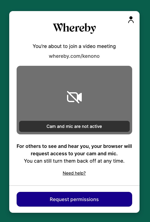 2.【Request permission】をクリック Wherebyがカメラとマイクにアクセスすることを許可します。