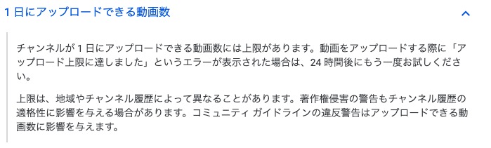 チャンネル毎に、1日にアップロードできる動画数には上限があり、上限は、地域やチャンネル履歴によって異なるということです。