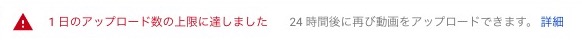 「この表示が出てから24時間アップロードできない」と解釈してしまう表記ですが、過去24時間以内のアップロード数に対して表示されているので、23時間前に沢山動画をアップしていて、アップロード数の上限に達した表示が出たのが、1時間前ということであれば、1時間待つだけで、再度アップロードできるようになります。 たくさんの動画をアップする必要があれば、この24時間を考えて、朝ある程度の動画をアップして、続きは夜、また次の昼といったようにして、24時間の枠に引っかからないようにするのも良いと思います。