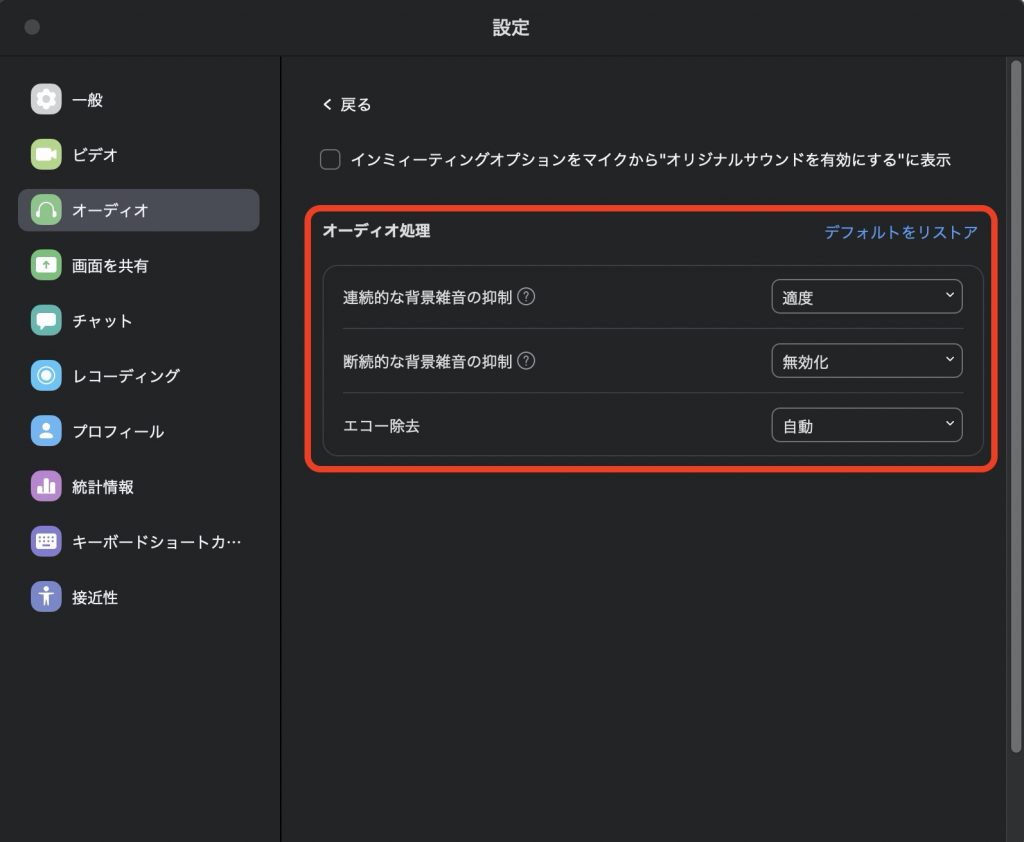 Zoomのノイズキャンセリング機能をオフにして、PC マイクから離れても、同じく音を拾う設定にします。