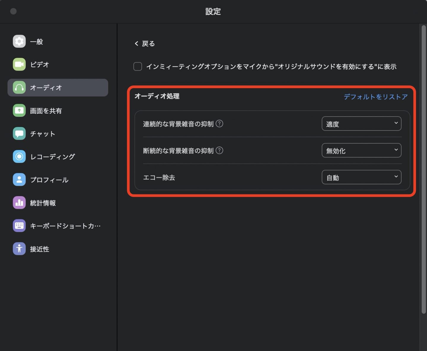 連続的な背景雑音の抑制 断続的な背景雑音の抑制 この2つが、ノイズキャンセリングの設定なので、それぞれ【自動】【適度】【強度】【無効化】から、それぞれ選んでみましょう。 【無効化】を選べば、完全にノイズキャンセリング機能がオフになりますが、聞きづらいことがあれば、強度、適度も検討してみて下さい。