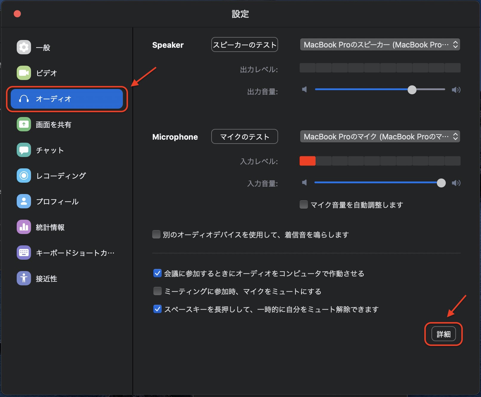 Zoomオーディオタブの詳細