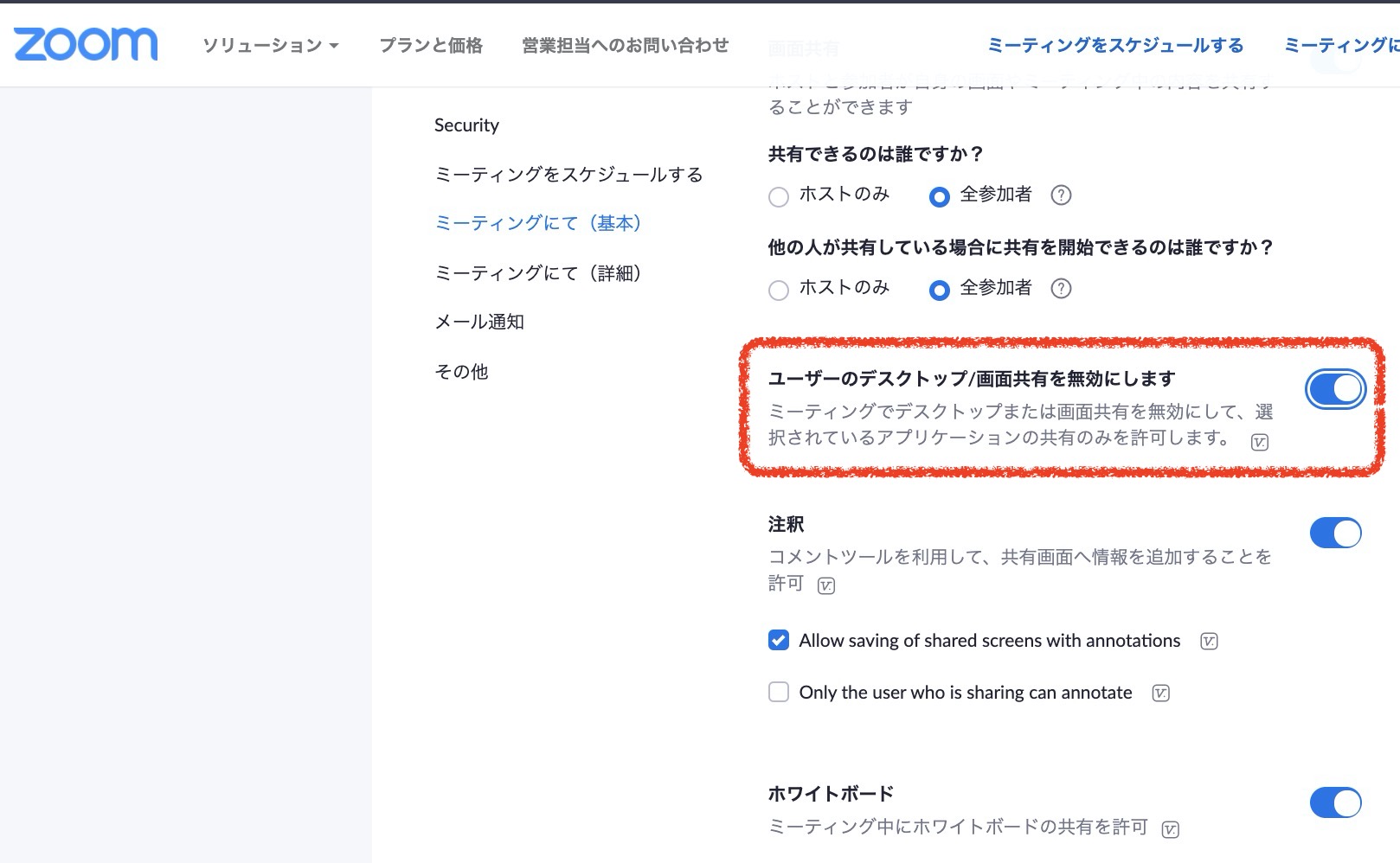 「ユーザーのデスクトップ/画面共有を無効にします」をオフに