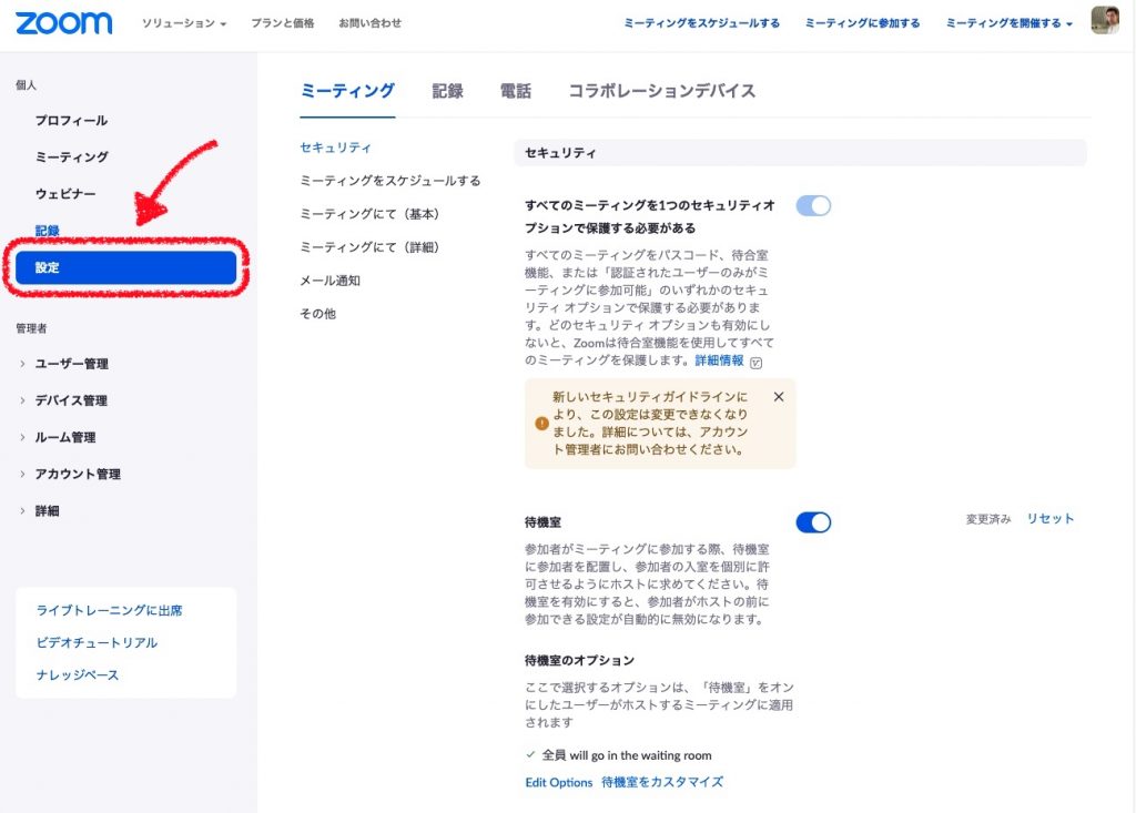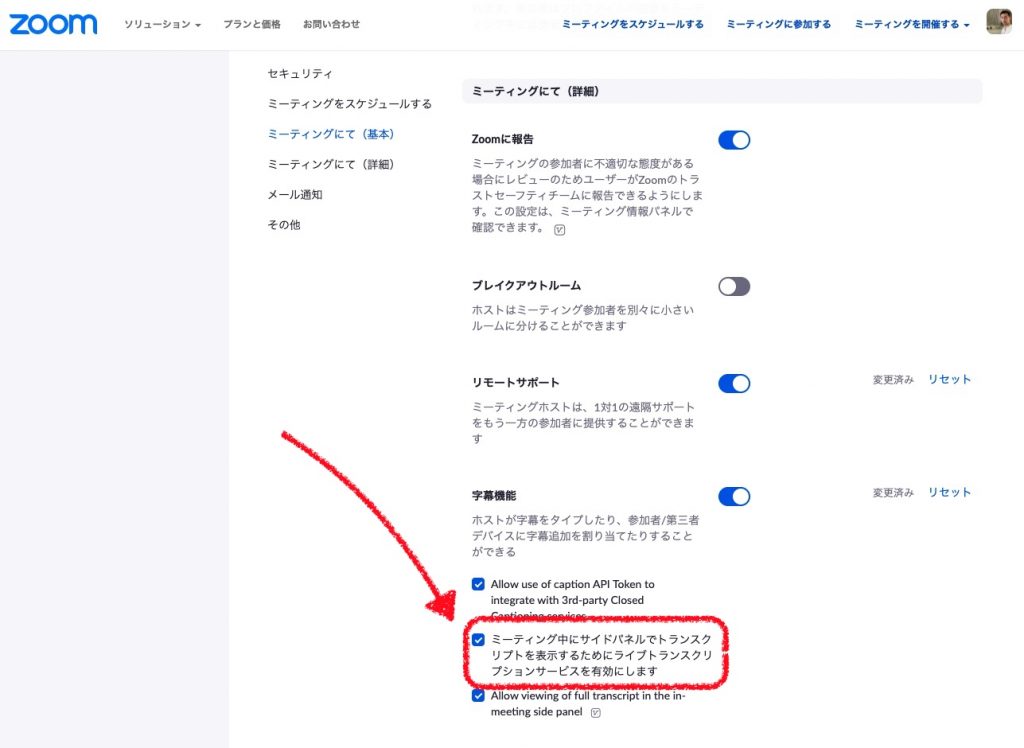 注意 先にご紹介したZoomのライブトランスクリプト機能をマイページからオフにしておく必要があります。 ※管理画面>設定>ミーティング(詳細)>字幕機能 から設定できます。