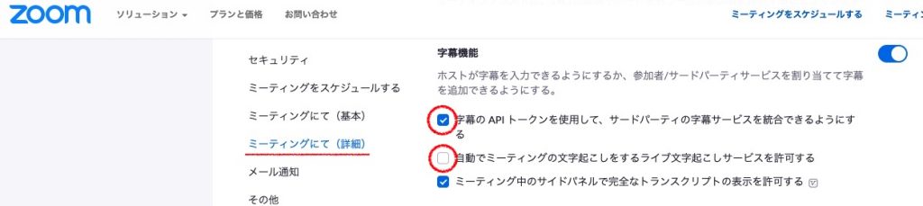 ややこしい名前ですが、Zoomが標準でもっているライブ文字起こしサービス (Zoom標準の英語専用の自動字幕システム)は、オフにしておく必要があります。 代わりに字幕のAPIトークンを使用して、サードパーティの字幕サービスを統合できるようにする はオン にしてください。 ※Zoomの公式サイト>設定画面の左側の設定 >サブメニューのミーティングにて をクリックすると表示されます。