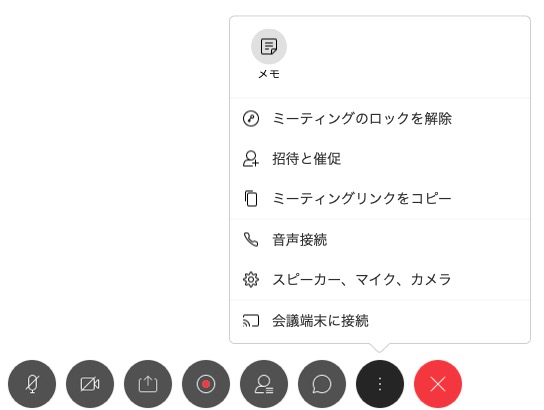Zoomと手順が違って戸惑ったのが、オンラインミーティング参加者への招待状作成の手順。 Zoomでは、参加者のウィンドウから招待URLをコピーすると思うのですが、 Webexの場合は、画面したの縦に3つ点が並んだボタンから、プルアップするメニューに【招待と催促】というメニューがあり、こちらをクリックして招待状をコピーします。