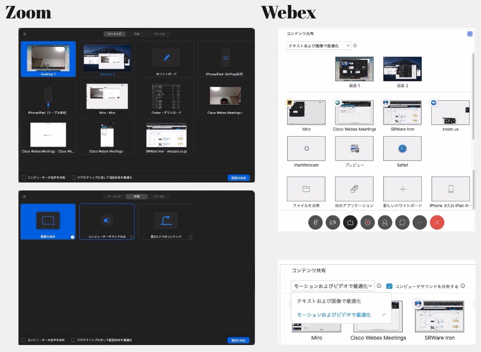 使用頻度の高い、画面共有ウィンドウ。 ZoomもWebexも出来ることはほぼ一緒で、動画や音声に最適化させたり、iPad iPhoneの画面を写したり、ホワイトボード、画面全体、開いているアプリの画面を共有することも出来ます。 Zoomの代替として、共有に関して心配することはないと思います。